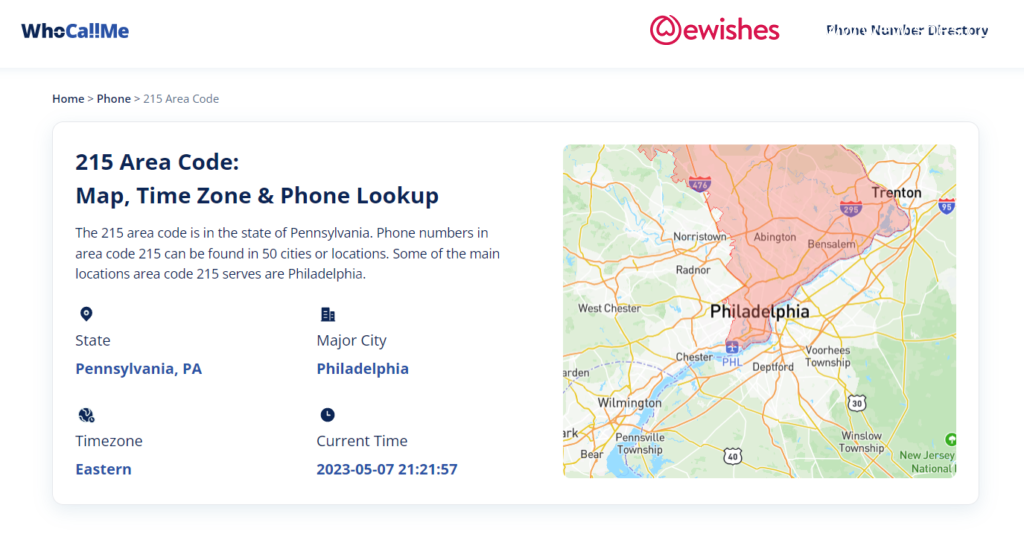All you need to do is enter the phone number in question, and the website will provide you with the name, address, and other relevant information about the caller. Besides, if you recognize the number as a 215 area code, you can go to the website and simply choose the phone number from the area code table. The service will provide you with any available information, including the caller's name and location.